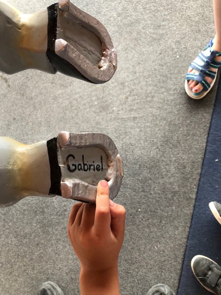 Gabriel rode the carousel and picked out a horse quickly. When the ride stopped, he pointed out the hoof.