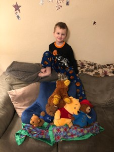 Gabe and his bear family: Brownie, Adam, Gabriel, Winnie the Pooh, and Paddington